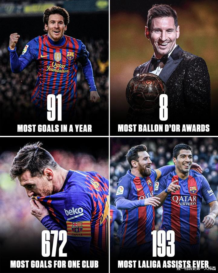 这四个纪录是:一年91进球、8个金球奖、单一俱乐部672进球、193次西甲纪录。其中一年91进球和8个金球奖经常被提及,这是梅西作为历史第一人的代表作之一,可以说是永远不可能被打破。